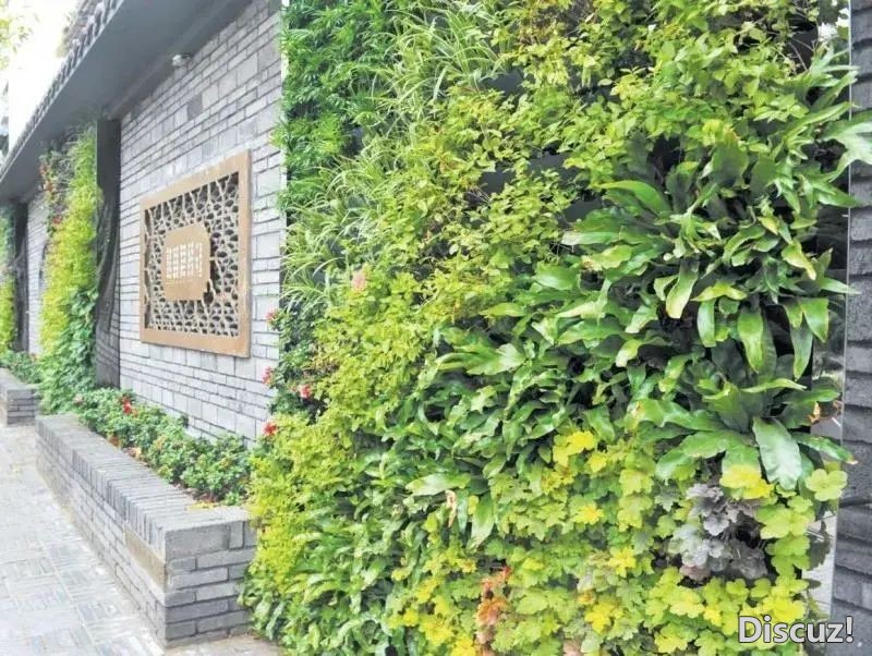 植栽式在有限的街道空间内,靠墙设置狭窄的种植带,以竖线条绿篱或花篱形成生态墙面。院落型外墙可采用院内栽植的形式,营造“一片绿意出墙来”的优美意境。