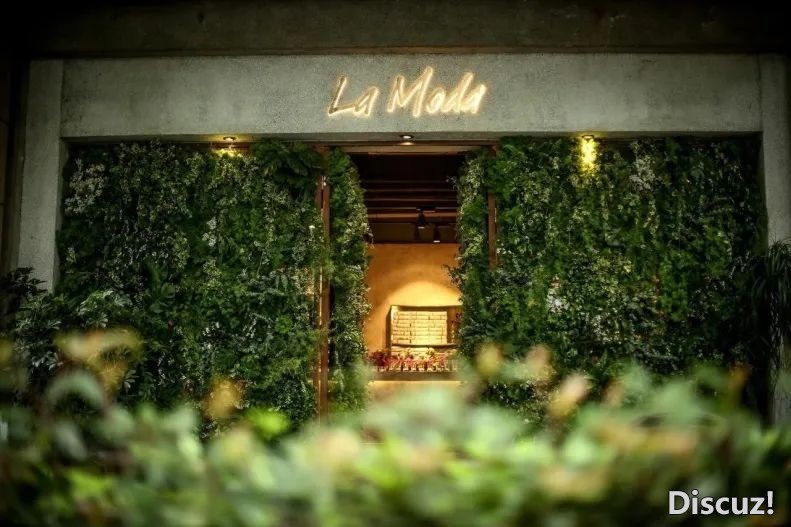 以垂直绿化装饰建筑入口,结合店招、灯光的设计,营造具有商业氛围的入口景观。采用的植物种类不同,所营造的氛围也不同,繁花似锦打造热闹的休闲商购氛围,清新绿意塑造雅致、高品味的店铺形象。