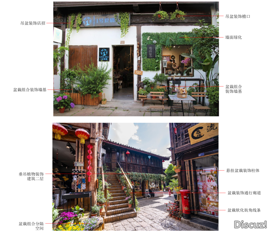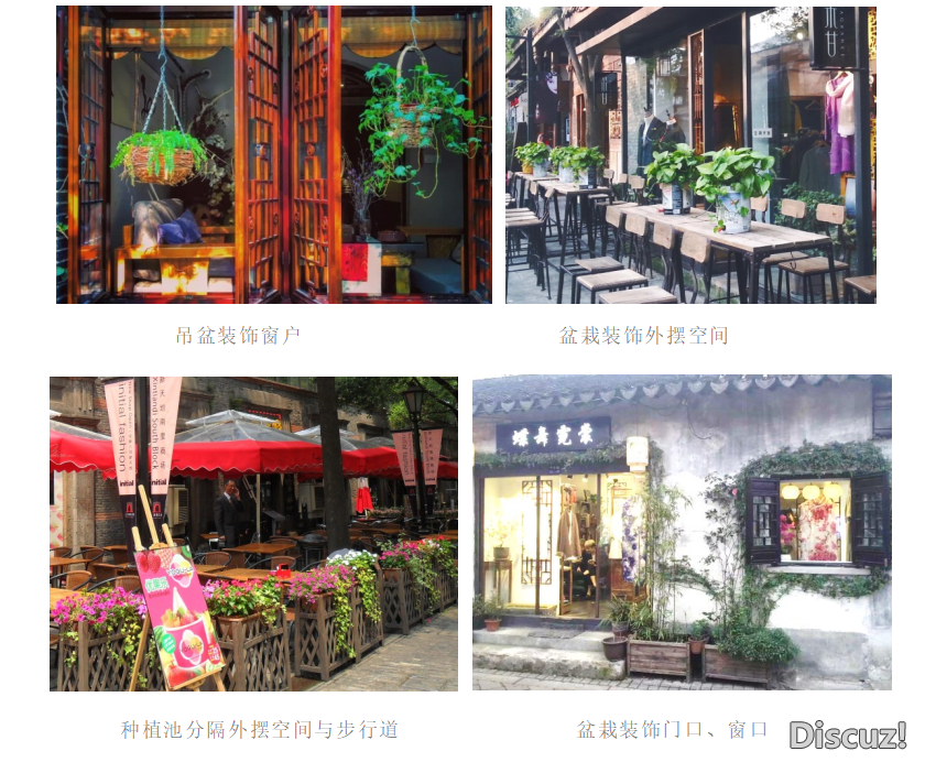 历史街区的建筑入口,包括门面、窗户、走廊、外摆空间等,需要重点营造商业氛围,以达到人流导入、促进消费的目的。历史街区景观元素往往以建筑、路面等硬质景观为主,缺少植被地栽空间,因此占地小、形式多样的盆栽、垂直绿化,成为深受街区青睐的绿化手段。