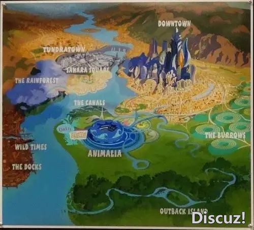 从布局上看,动物城实际上类似于迪士尼主题公园的一个动画的放大版,围绕“中心城堡”划分了不同主题的区域,互相之间由多样化的交通组织过渡与衔接,保证各个分区有不同特色的同时又融洽的合为一体。