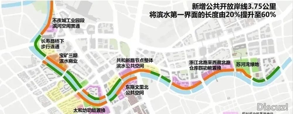 2、多元开放。苏州河通过置换两侧的产业用地,植入商业设施、文化设施、体育设施和儿童设施,增加不同年龄段人群的活动项目,延长滨水地带的使用时间,达到增加滨水空间活力和吸引力的目的。
