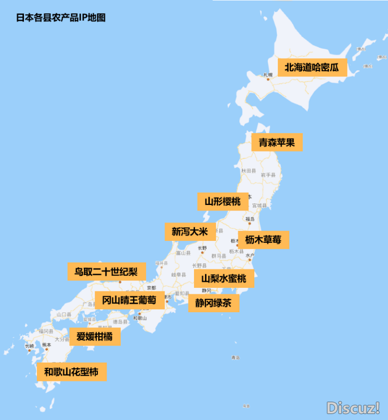 众所周知,日本由于地理和自然环境因素,农业发展可以说是先天不足:平原面积狭小,耕地面积严重不足;多火山、地震等自然灾害......这些原因直接限制了农作物高产量的发展。但日本农产品的出口率却逐年攀升,商品率屡创新高,大部分地区达到95%以上,甚至100%。日本农产品也逐渐成为高端、昂贵、精品的代名词。日本“一县一品、一村一品”的发展策略持续了几十年,现已形成十大农业区。各个农业区都有标志性的农产品。爱媛橙、冈山晴王葡萄、枥木草莓、青森苹果等特色农产品陆续爆红,堪称目的地代言的头部IP。