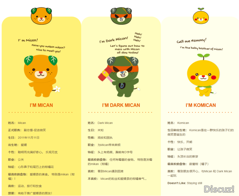 以柑橘为元素,打造爱媛县吉祥物。爱媛吉祥物MICAN家族的设计,融合了橘子与可爱的小狗等元素,在日本大受欢迎,曾在吉祥物大赏中荣获第三名。而MICAN的发音,也和日语中的“柑橘”一词相似。