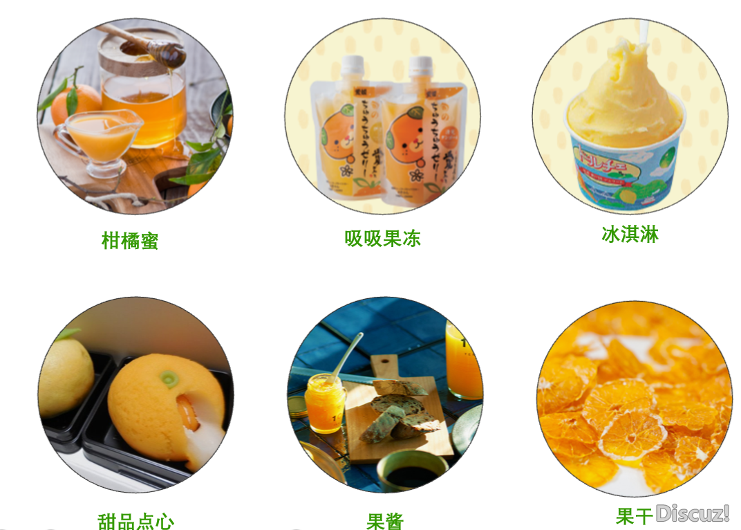 3. 柑橘产业链延伸柑橘作为水果,除了直接食用以外,还能加工成各类果汁、果干等商品,以便保存、运输、销往各地。衍生产品的开发,极大地丰富了爱媛县的柑橘产业链。柑橘食品种类繁多,像柑橘蜜、柑橘吸吸果冻、柑橘果酱、蜜柑啤酒、橘子咖啡......除了吃喝玩,爱媛的衍生品还涉及到文具、洗护品、调味品等……例如,橘子浴盐、橘子肥皂、橘子精油......