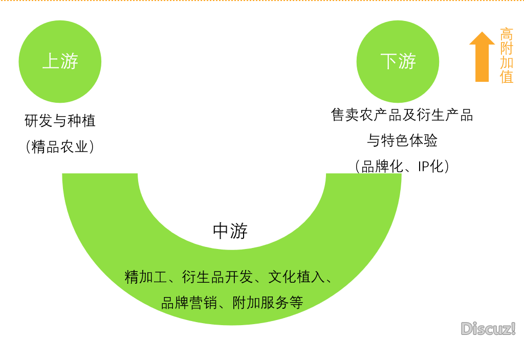 反观爱媛柑橘,遵循“微笑曲线”,向高附加值的营销品牌上靠拢,将优质的、差异化的服务打造成产品的一部分,以创造最高价值。上游重研发,做精品农业;中游通过精加工、衍生品开发、文化植入、品牌营销、附加服务等手段;最终在下游售卖精致的农产品及衍生产品及其特色体验。