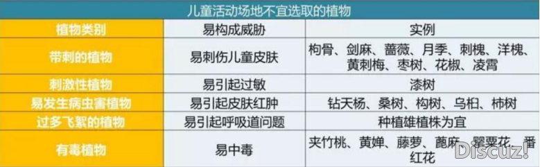 植物的选择应以乔木为主,稀疏且庇荫;以灌木为辅,采用无刺无毒的品种;草坪要选择耐践踏品种。此外,也要慎重选择那些气味难闻、易产生过多飞絮和浆果类的植物。