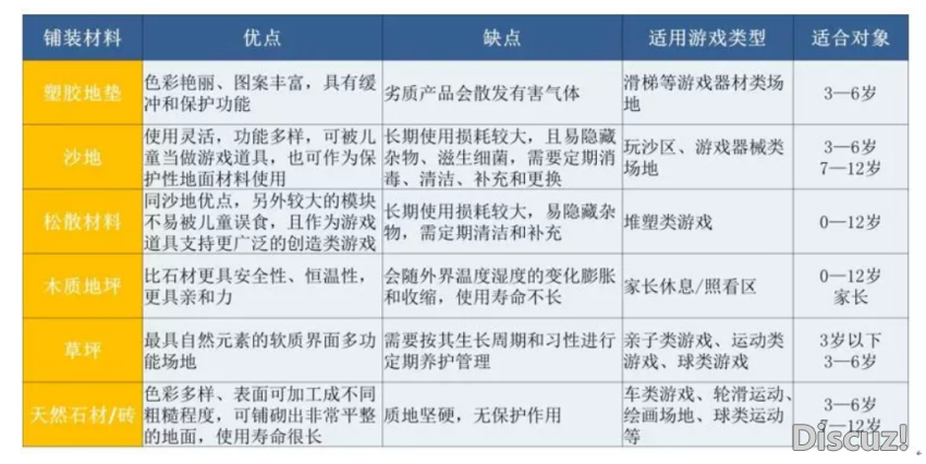 通向儿童活动场地的道路和儿童活动场地内的道路表面要平整防滑,方便亲子能快速进入活动空间,同时要方便家长使用婴儿车、儿童小汽车等器材。在所有的游戏设施下都应该采用保护性的地面,如沙地、注塑橡胶、橡胶垫等。