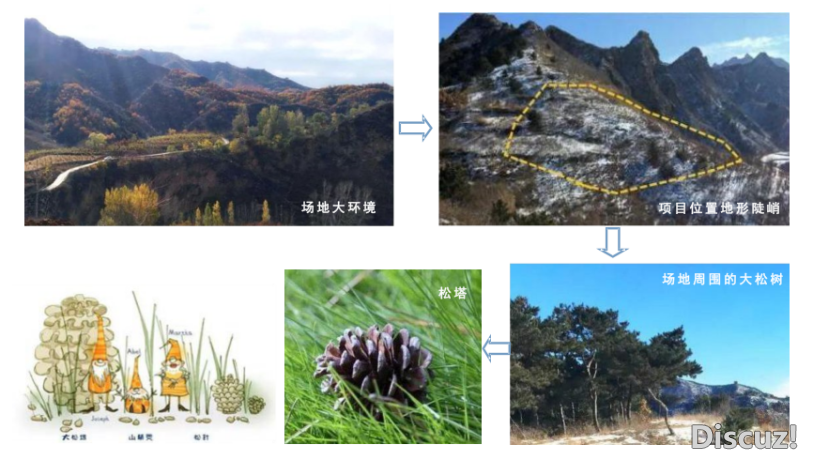 (1)场景化项目设计理念来源于场地周围种植的大量松树,大松树周围铺满了许多成熟落地的松塔。设计师充分考虑儿童的心理需求,将松塔这一具象的物体作为主题,编写了充满童话趣味的故事——“松塔奇遇记”。