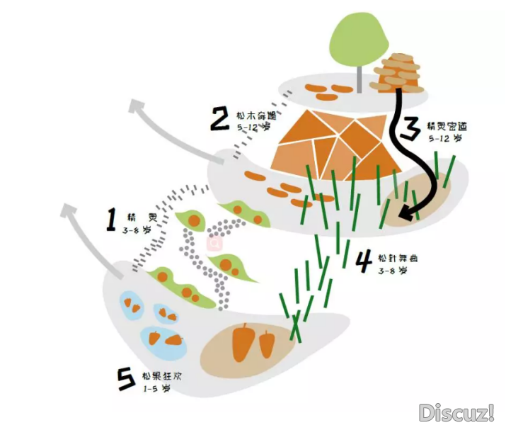 (4)多元性与创意性的活动体验创意活动设施:场所中的游戏设施结合了“松塔奇遇记”这一童话主题,按照故事脉络打造了四个部分:精灵村+松木奇遇+山顶大松塔+山脚松针松子,每一个部分都设计了具有创意的活动设施和活动内容。