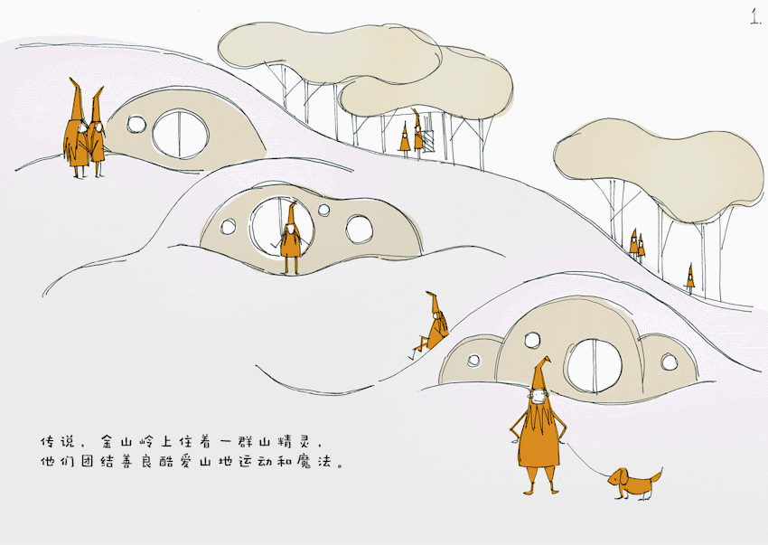 (3)尺度宜人的场所空间设计师根据不同年龄段儿童的身高特点以及不同活动类型的特点,打造出了尺度宜人的场所空间。在30度缓坡上有许多精灵屋,供3-8岁的孩子游玩。精灵屋分为四种,有和妈妈一起听山精灵松塔故事的大屋;有属于孩子尺度的秘密小屋;“精灵羊”自己生活的羊屋以及和“精灵兔”生活的小兔屋。