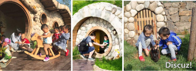 结合自然体验的课程:为了让儿童更好地接近大自然,尊重儿童天性和发展规律,园区内设计安放了生态区,喂养小羊、小兔子等儿童喜爱、易接近的动物。儿童可以与小动物近距离接触,通过触摸、爱抚、喂养等行为,增强儿童的共情感与同理心,使其身心得到发展。同时利用雾喷、重力感受、树皮 感知、沙子触摸等其他感官的刺激来刺激儿童对周围环境的感知,从而认识自然。