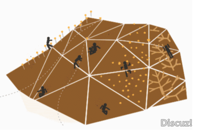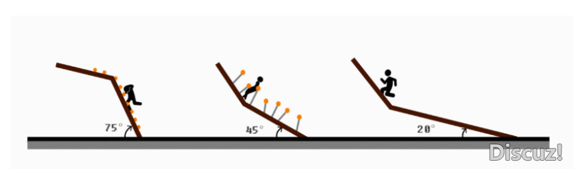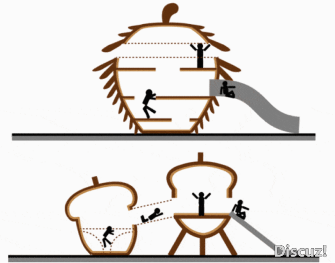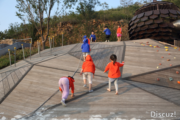 精灵村中利用大松子鳞片组合在一起变身成为松木大折板;结合地形设计运用大面积的木折面组合成新的场所—松木奇遇,从缓坡到陡坡的整个地形过渡,根据每块折板不同的陡缓程度来组合出不同玩耍的内容:75°最陡坡设置攀岩区,;45°中坡设置绳索和爬杆;20°缓坡可以让孩子自己冲刺上山顶。