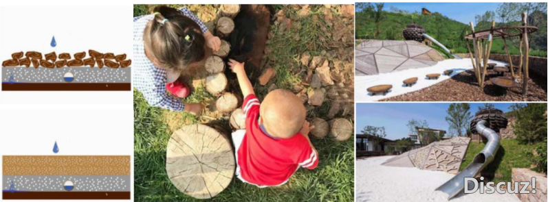 植物品种的选择上尽可能选用对儿童健康没有危害的当地的乡土树种、乡土植物,运用 可透水的树皮和沙来作为场地的主要活动地面铺装,避免了城市里的塑料触感,取而代之的是自然的生态触感。