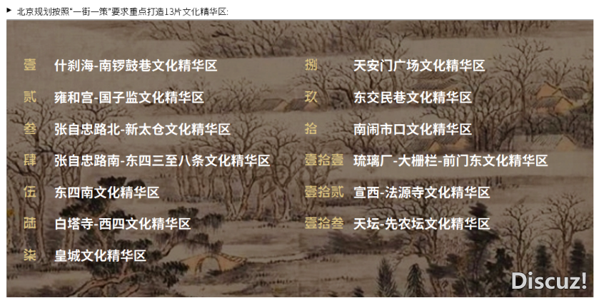 精细化城市设计助力中国城市更新:4月23日,自然资源部人事司、国土空间规划局组织开展责任规划师制度建设联合调研,就责任规划师(社区规划师、乡村规划师等)制度助力城市更新、社区生活圈建设和乡村振兴等开展交流研讨。截至目前,北京全市已有15个城区及亦庄开发区完成了责任规划师聘任,共签约了301个责任规划师团队,覆盖了318个街道、乡镇和片区,覆盖率达到95%以上。2020年4月北京发布的《规划》中提出,按照“一街一策”要求,北京将重点打造13片文化精华区。其中包括: