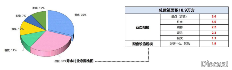 (5)运营前置,以商业运营思维指导项目策划通过分析研究国内古镇古村类成熟景区在各区县、地市游客量占比,提取有效数据进行平均值估算。按照贺州市和度假区成熟游客量进行赋权估算,测算秀水村成熟期游客量为120万/年。确定总建筑面积18.9万方,并进行商业运营业态配比估算秀水村景点占比30%、住宿占比30%、餐饮+娱乐+购物占比30%、配套占比10%。按照运营需求,进行酒店、民宿、商铺、作坊、餐饮、酒吧、游客中心、公共配套设施等规模测算。