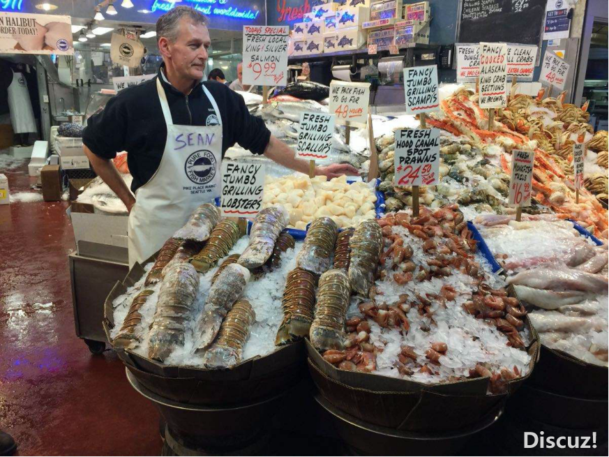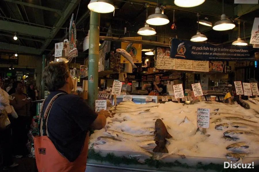 (5)必游地之四——飞鱼秀派克市场的飞鱼秀已入选美国MBA营销课程,可见相当成功。当客户惠顾,前台服务员会大声吆喝顾客的需求,并将顾客挑好的食品抛向后台进行处理,后台同样回复并处理打包后,像投篮一样扔回前台。