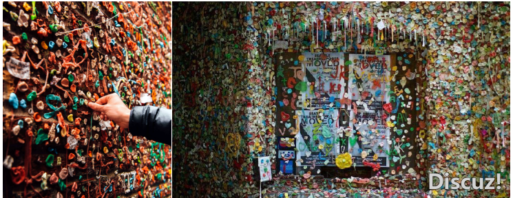 (2)必游地之一——口香糖墙“口香糖墙”堪称是全世界最恶心的景点,它位于西雅图派克市场(Pike Place Market),这道墙是“市场戏院”其中一幅外墙,长15米、高4.5米、厚2.5米。令人不可思议的是,这面墙上密密麻麻粘满了上百万块嚼过的口香糖,形状有人脸、小狗,还有心形、和平标志等,从上到下遍布五颜六色的口香糖,以及无数干掉的口水。可以说是一件不断增厚、扩大的艺术品。排队看演出的游客经常“顺手而为”,且屡禁不止,在1999年正式成为“景点”。
