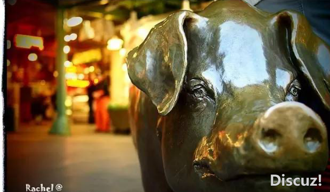 派克市场里面,大家会看到一只金色的铜猪雕像,很多人在这里跟它合影,这只猪是有名字的,它的名字叫Rachel,是一只巨大的存钱罐,脖子上有个可以投钱进去的洞。