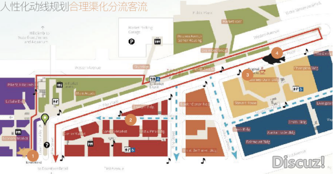 其中从公共贸易场景来看,满足了所有人的需求,包括店主、农渔民、顾客、游客。从历史遗迹来看,历史建筑得到妥善保护,使当地文化得到传承。从社会服务场景看,包括贵族中心、儿童服务中心、社区诊所、食品仓储以及面向低收入者和老人的可支付住宅、众多公益机构的社区资助计划。旅游场景则着眼于主题性深入半自助游客的需求满足,同时也满足大众游客的餐饮住宿需求。而内部标志化景点结合随机演艺内容,首尾相扣,驱动客流流动。各类型场景共同培养出了社区骄傲感,通过自我意识的唤醒,驱动整个社区的良性运营。