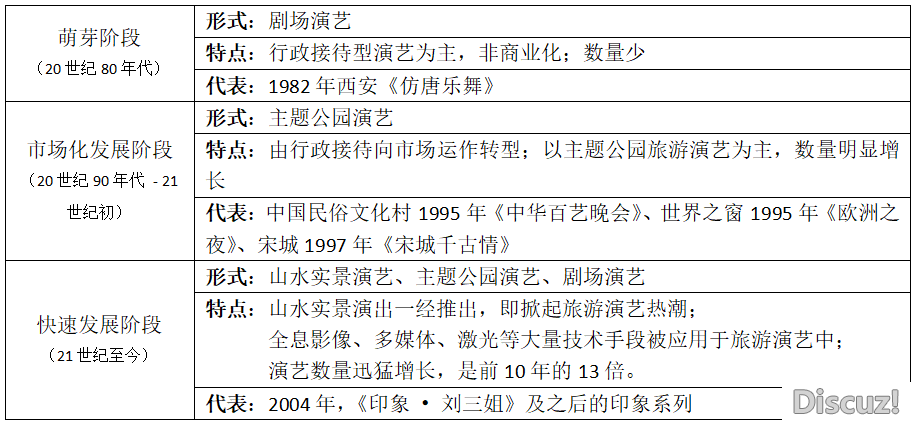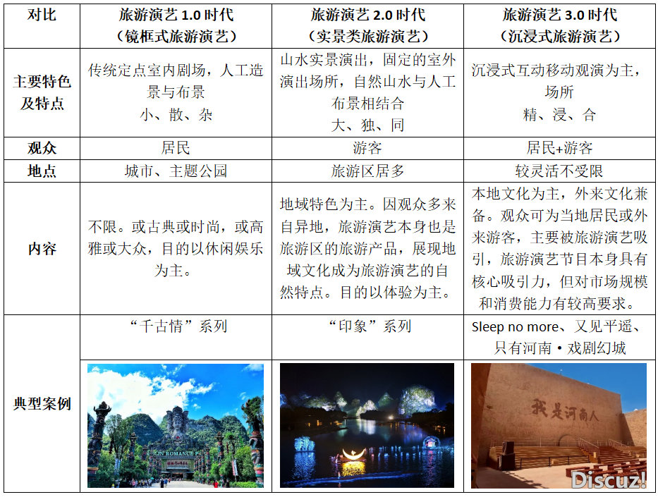 其中旅游演艺1.0时代也称为镜框式旅游演艺,旅游演艺2.0时代称为实景类旅游演艺,旅游演艺3.0时代被称为沉浸式旅游演艺。(引自毕剑.旅游演艺:概念辨析、类别梳理与关系模型[J].邵阳学院学报(社会科学版),2019,18(01):61-68.)