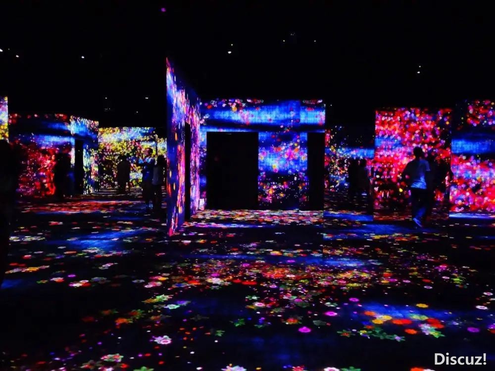另一方面是科技化场景体验。即多元化运用各种新媒体技术,加上AR、VR、MR等科技应用,再加上虚实结合的空间营造,打造出沉浸式环境,让人体验到感官的震撼和思维的认同。以Team Lab制作的《花舞森林与未来游乐园》为代表,艺术家利用新媒体技术与观者产生互动,精心营造奇幻世界:娇艳的花朵环绕生长触摸成蕾、闪烁的水晶灯依观众的心意点亮,四周都是花香味。