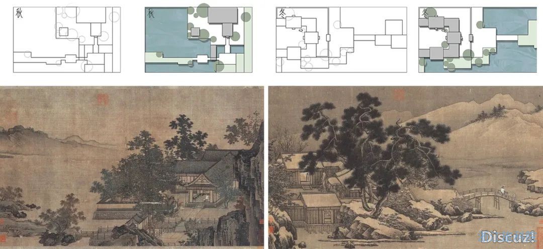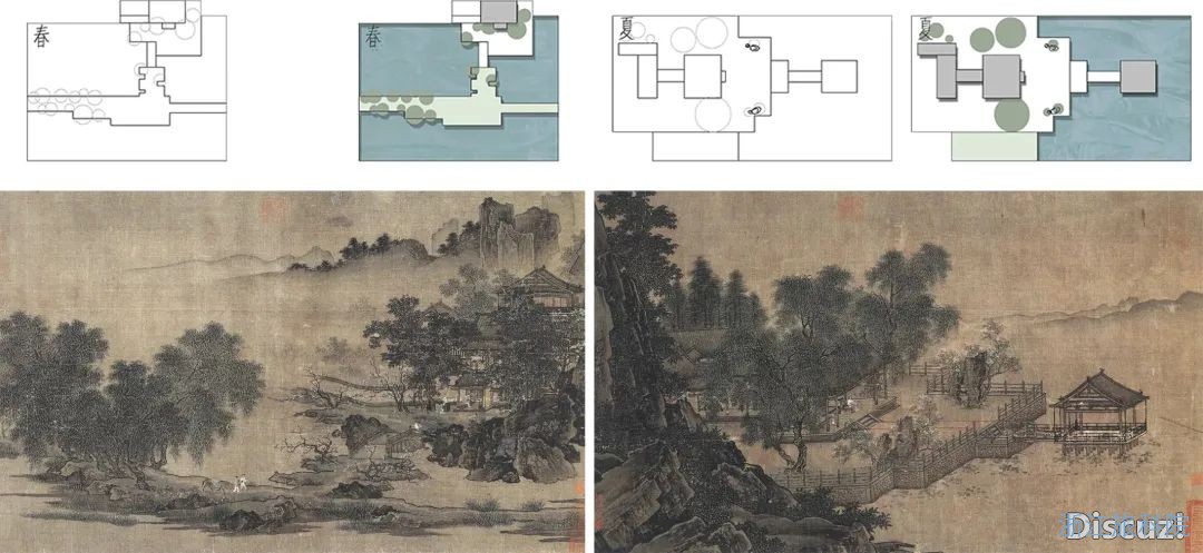 春日宴柳,仲夏浓阴,芦荻秋瑟,霜雪暮冬。园林一直被认为是逍遥优雅的隐居处所,承载着表达着古人的思想与生活,而各时期的古画中,同时也展现着造园写实之景,还有写意山水之时。