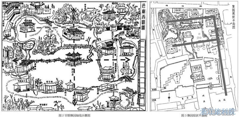 左:早期豫园轴线示意图 右:豫园现状平面图