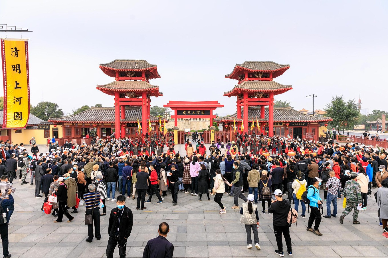 开封清明上河园位于河南省开封市龙亭湖西岸,是一座以宋代文化为主题的大型历史文化公园。景区以北宋著名画家张择端的《清明上河图》为蓝本,按照1:1的比例,集中再现了原图风物景观。园区占地600余亩,其中水面面积达180亩,拥有大小古建筑400余栋,形成了完整的宋代建筑群。自1998年10月28日正式对外开放以来,清明上河园凭借其独特的文化定位和丰富的旅游体验,于2011年被评为国家AAAAA级旅游景区,并已成为中国非物质文化遗产的展演基地。