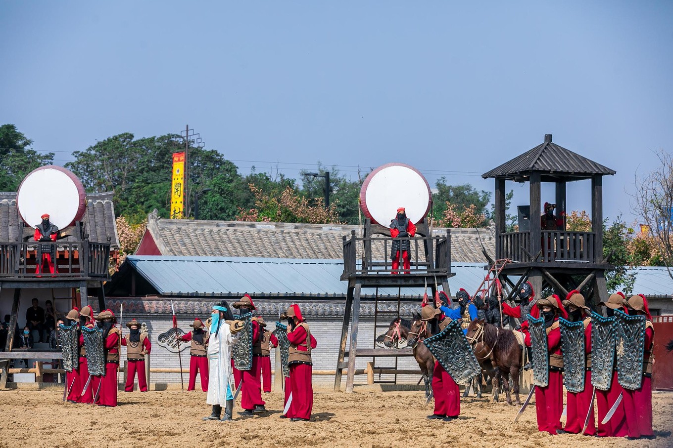 演出特色:该剧成功地将传统戏曲的程式化动作与现代影视的特技手段相结合,创造出一种全新的“实景马战剧”形式。通过运用扬沙、炮战、飞箭等实景特效,极大地增强了战争场面的真实感和观众的沉浸感。