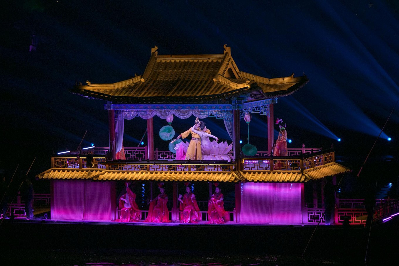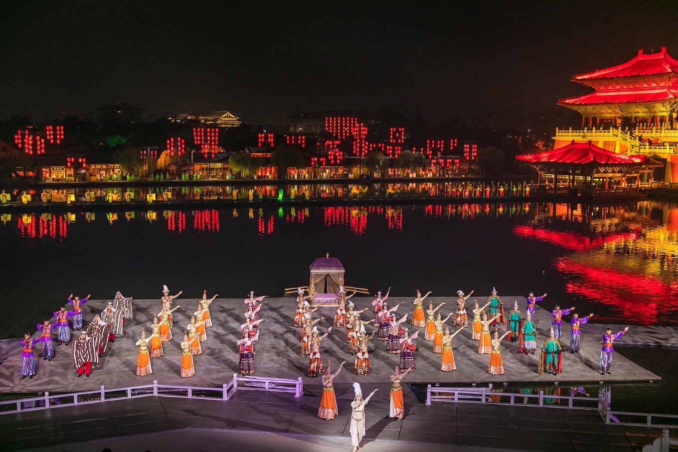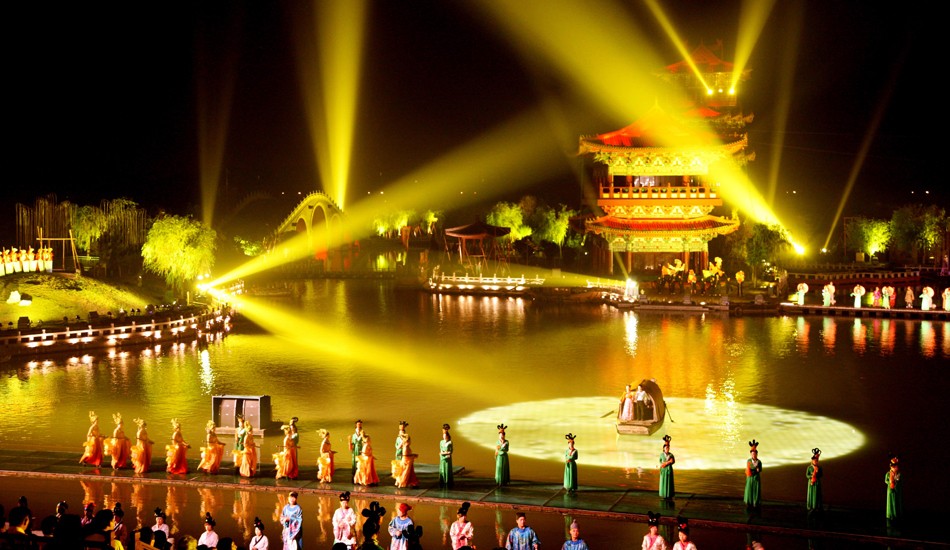 演出内容与形式:演出以八首经典的宋词为串联,分为六幕四场,艺术化地再现了北宋王朝从兴盛到衰败的历史画卷。整场演出在真实的景龙湖水面上进行,将亭台楼阁、桥梁画舫作为舞台背景,营造出如诗如画的视听意境。