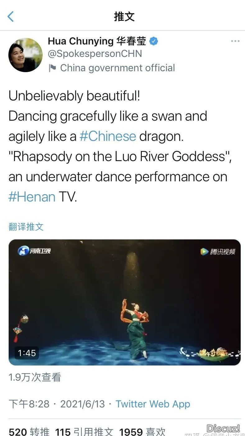 华春莹推特发文直接推荐开场节目《洛神水赋》,推文:“难以置信的美!舞蹈像天鹅一样优雅,像中国龙一样敏捷(引用《洛神赋》名句‘翩若惊鸿,婉若游龙’)。《洛神水赋》,河南卫视的一支水下舞蹈节目。”